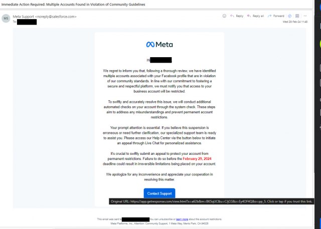 "Dragi partneri, primetili smo phishing email koji stiže salesforce.com domena. Radi se o sofisticiranijem primeru phishinga koji nije na prvi pogled uočljiv, pa vas molimo da obratite pažnju i ne pratite linkove koji se nalaze u telu mejla", stoji u poruci koju je poslala Meta.