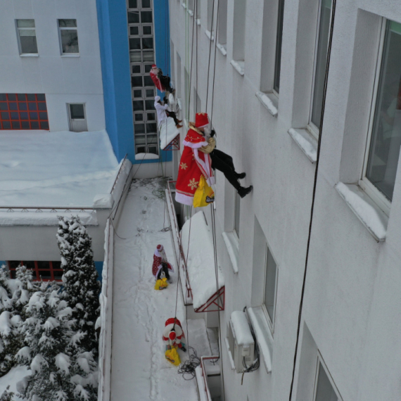 Pripadnici Gorske službe spasavanja, obučeni kako Deda Mrazovi, spustili su se sa krova zgrade Dečije klinike i doneli mališanima novogodišnje poklone, u akciji koju tradicionalno organizuje kompanija "Fazi" već sedam godina.