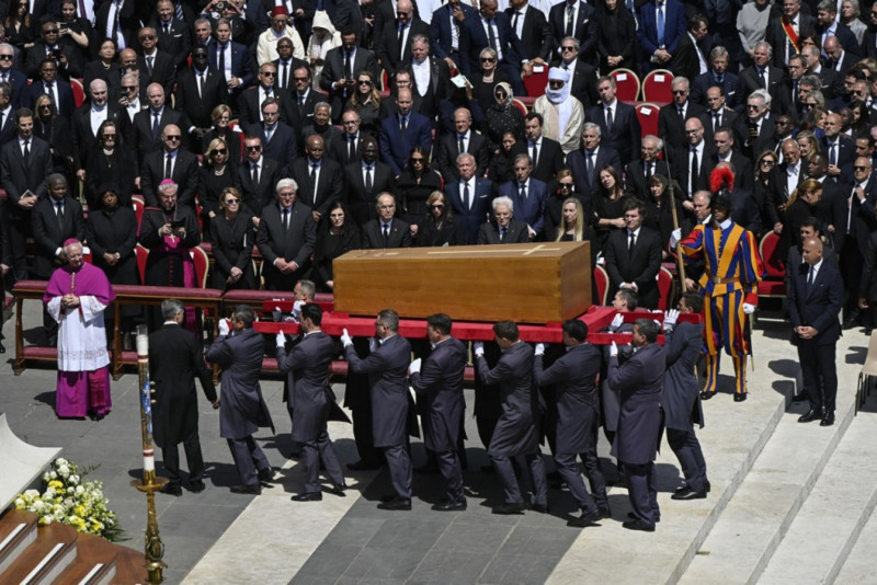 Američki predsednik Donald Tramp i njegova supruga Melanija takođe su prisustvovali, kao i većina evropskih lidera, uključujući Emanuela Makrona, Olafa Šolca i Đorđu Meloni.