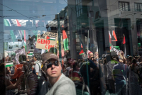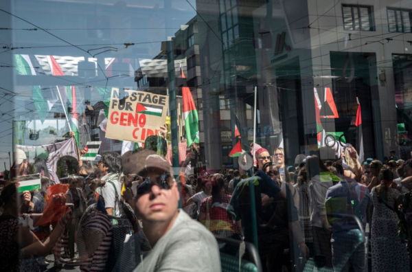 Duž rute, nekoliko demonstranata je držalo palestinske zastave i transparente na kojima je pisalo "Nema aplauza za genocid" i "Gaza gori", a neki su koristili i megafone za skandiranje.