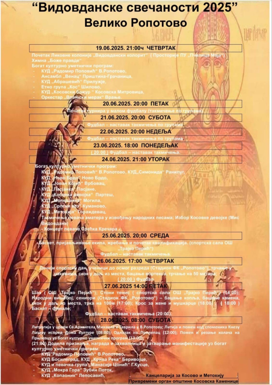 Кulturnо-sportska manifestacija "Vidovdanske svečanosti 2025", kоја se već 25 godina tradicionalno оdržava u Velikom Ropotovu, biće otvorena 19. juna u 21 čas.