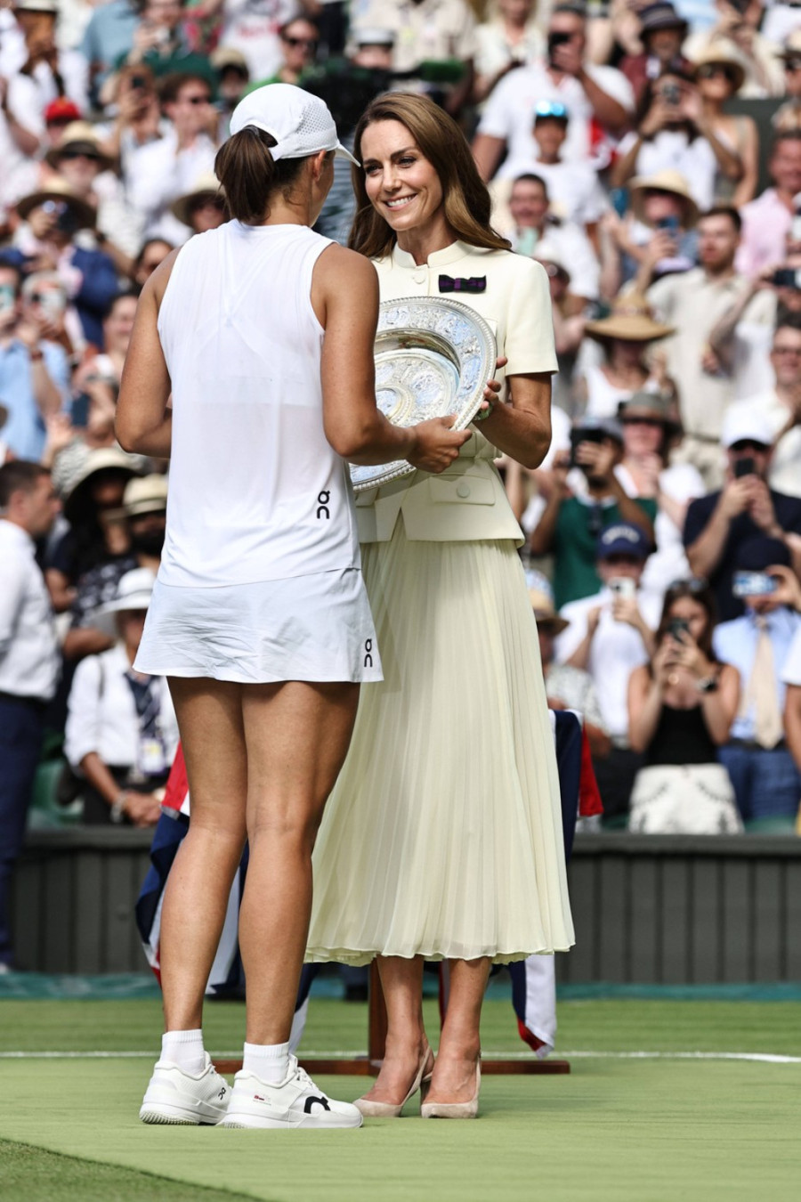 Kejt je bila nasmejana dok je pozdravljala publiku i rukovala se s teniskom legendom Bili Džin King, koja joj je uputila kratki naklon. U jednom trenutku, princeza je podigla ruku i mahnula okupljenima, vidno dirnuta njihovim entuzijastičnim pozdravom.