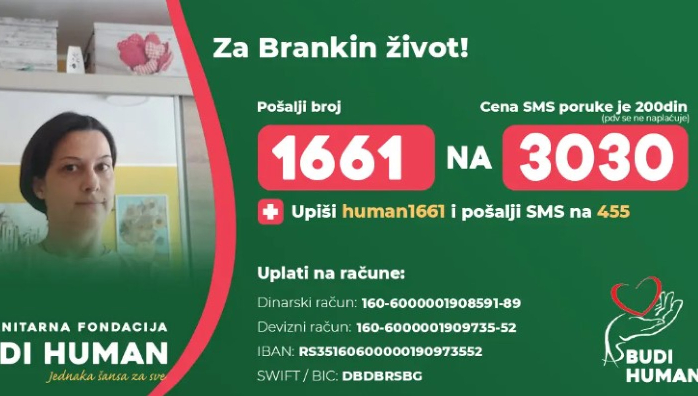 S obzirom na to da lečenje iziskuje velike troškove, 44-godišnjoj Branki je potrebna pomoć svih ljudi velikog srca, kako bi što pre obezbedila sredstva za nastavak lečenja!