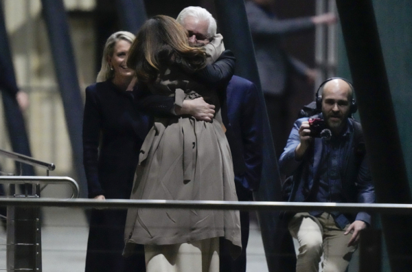 Asanž je izašao iz aviona dok su brojni okupljeni ljudi klicali, prenosi Skaj njuz. Zatim je otišao do porodice i prijatelja, i zagrlio svoju ženu Stelu Asanž, držeći je u vazduhu pre nego što je poljubio.