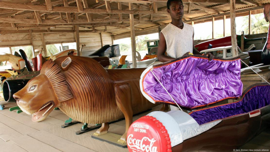 Na mnogim mestima u svetu, preminuli se sahranjuju u zemlju. U Gani se razvila umetnost pravljenja kovčega koja malo podseća na uobičajene modele - jer kovčeg simbolizuje ono što je pokojniku bilo važno u životu: ako je bio muzičar, kovčeg može biti u obliku gitare. Ako je bio vlasnik bara, zašto ne bi poslednje počivalište imalo oblik flaše Koka-kole? Mašta nema granica, kao ni cena tih luksuznih kovčega.