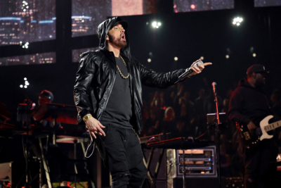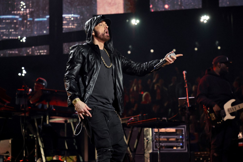 Pedesetdvogodišnji reper izašao je na scenu za trku Formule 1 u Abu Dabiju, a tokom nastupa otpevao je pesmu Without Me, koja detaljno opisuje njegov komplikovan odnos sa majkom.