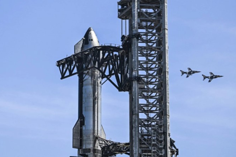 "Super Hevi" raketa, visoka 70,7 metara i njen gornji stepen Staršip, visine 52 metra, nalazili su se na lansirnom nosaču u "Spejseksovim" postrojenjima Starbejz dok su se punili gorivom pre poletanja.