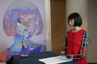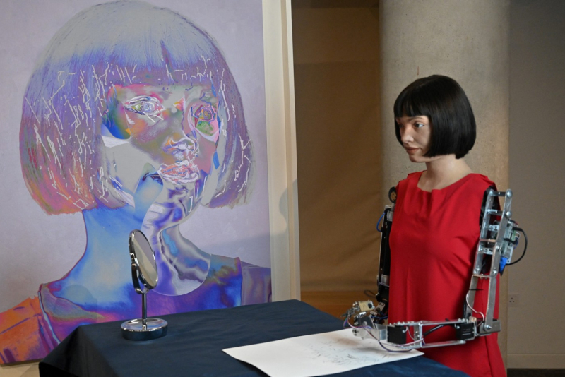 Robot umetnik koji koristi veštačku inteligenciju da stvara slike ili skuplture ima kamere u očima i bioničke ruke. Kreće se i govori samostalno, bez ljudske intervencije.