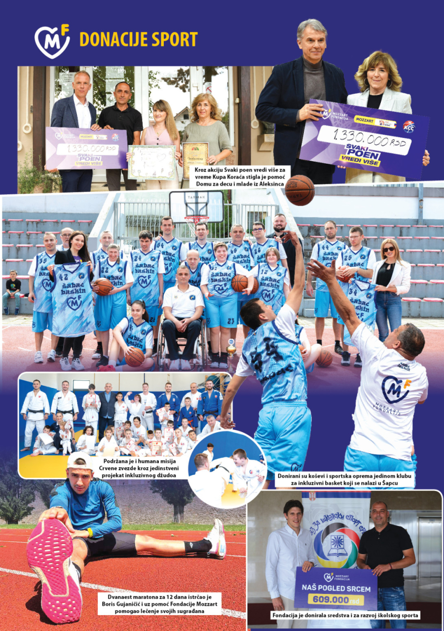 Nisu zaboravljena ni brojna udruženja, pogotovo kroz akciju Mozzart Superšut, u okviru koje su najbolji šuteri u Superligi usmeravali donacije Fondacije Mozzart širom zemlje, gotovo istom brzinom kao i loptu u mreže. Pomoć je stigla Udruženju "Zagrljaj" iz Valjeva i "Anđeli" iz Užica, Dečje srce iz Beograda, Domu Kolevka iz Subotice, mališanima sa Kosova i Metohije...